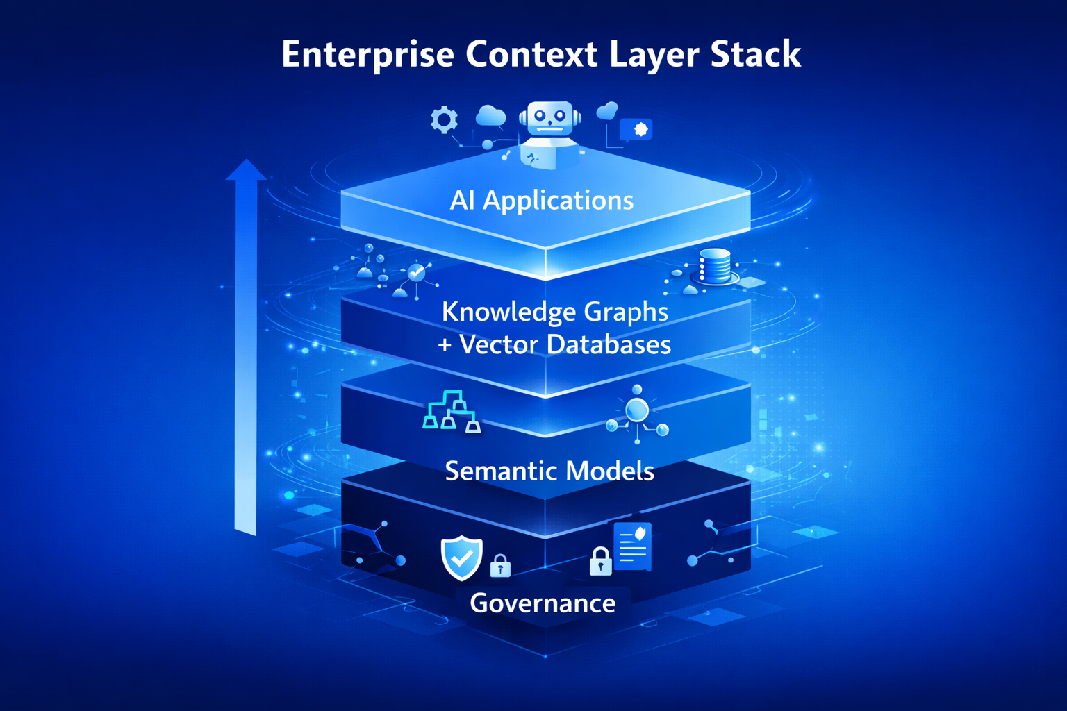 The context layer solves this through four integrated components. Knowledge graphs provide structure and relationships. Vector databases enable fast semantic retrieval. Semantic models standardize business meaning. Governance infrastructure ensures trust and compliance. Together, they form a coherent stack that makes enterprise AI reliable, accurate, and auditable.