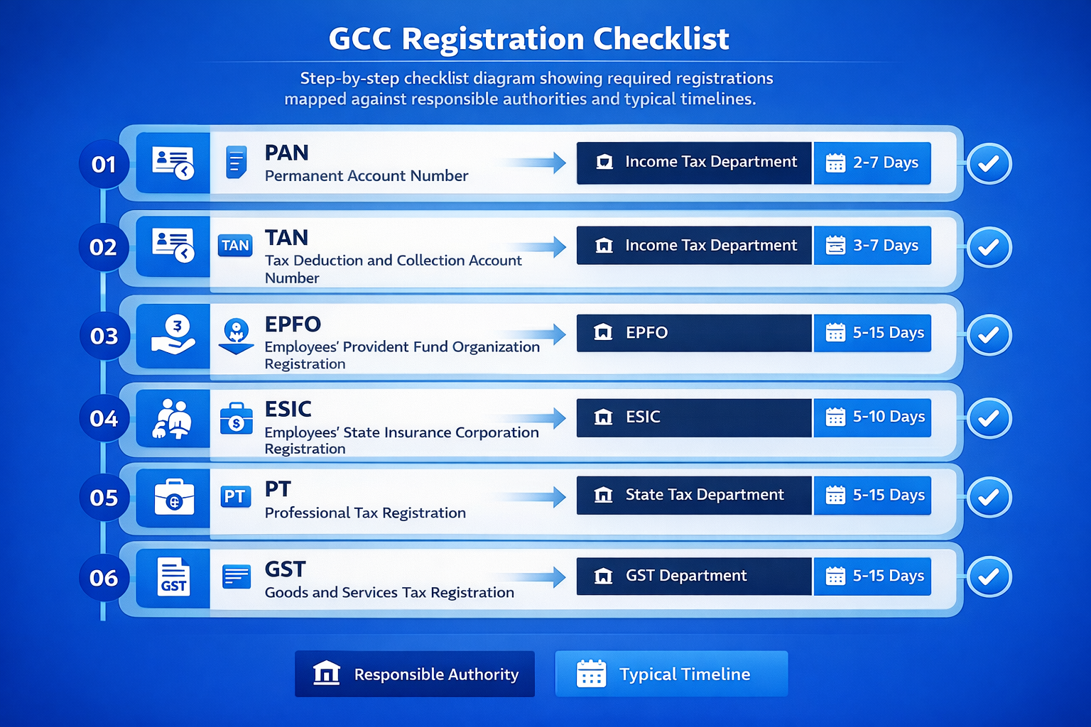 Required registrations include PAN and TAN from the Income Tax Department, EPF registration from EPFO, ESI registration from ESIC, professional tax registration in applicable states, and GST registration. Each registration is a prerequisite for lawful payroll operations.