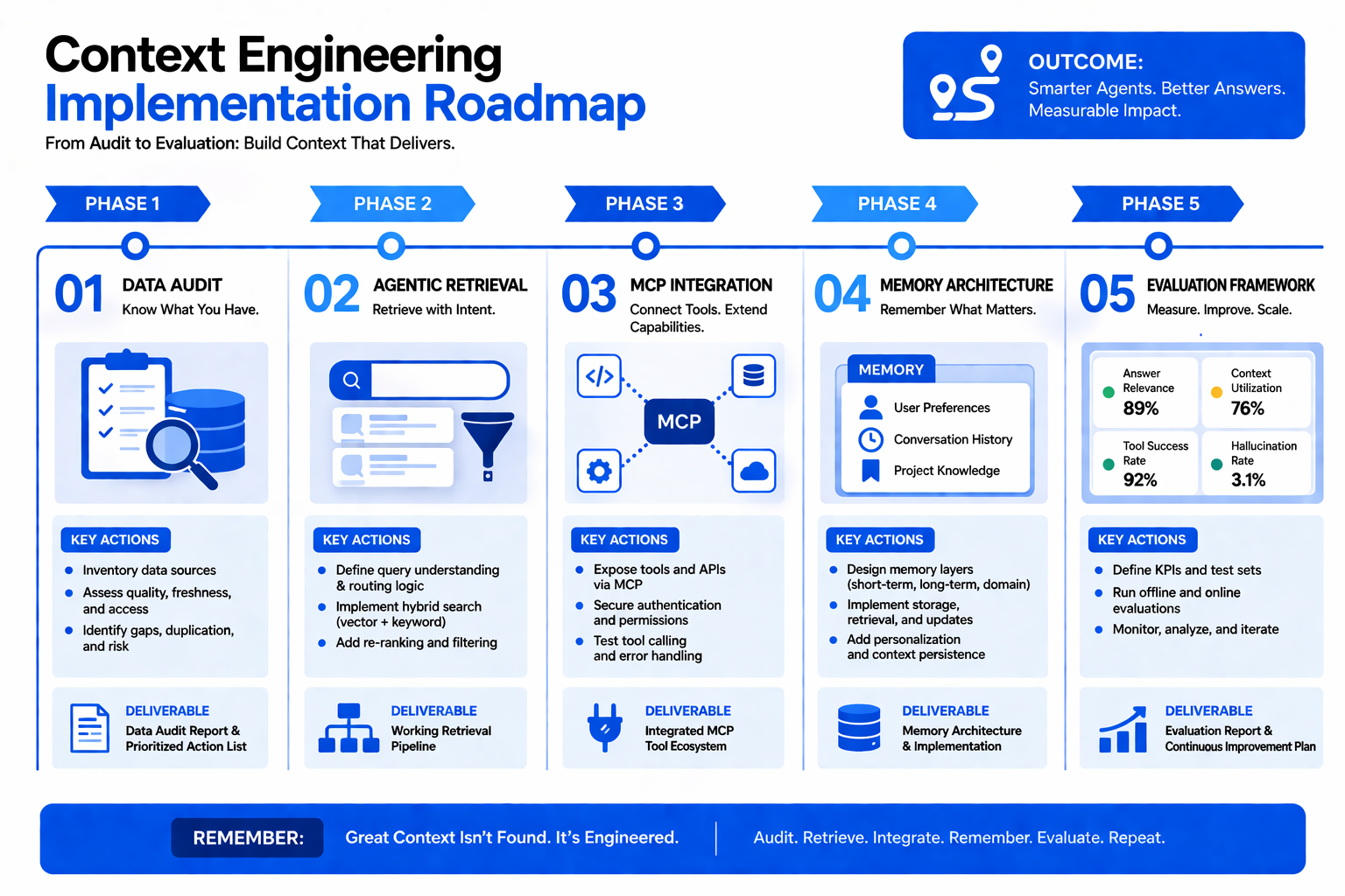 - Start with data foundations, not models. Audit your enterprise knowledge bases for currency, consistency, and coverage before building retrieval pipelines. Context engineering demands clean, well-structured data as its raw material.